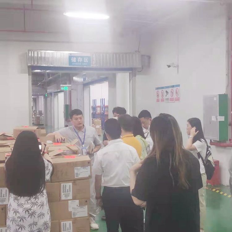 工作人員帶領(lǐng)考察團參觀入駐企業(yè)的倉儲區(qū),了解倉儲運營流程。